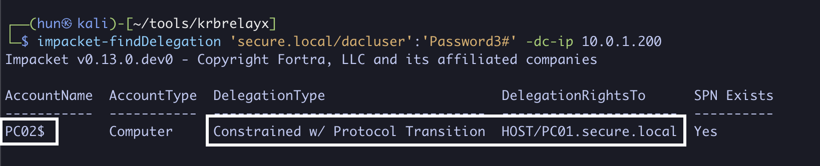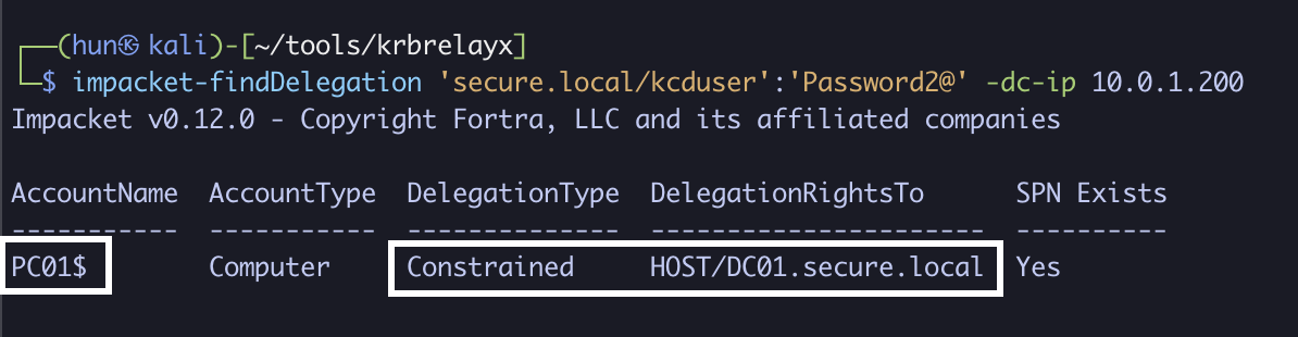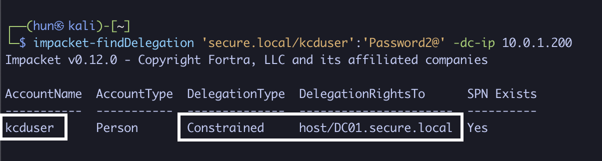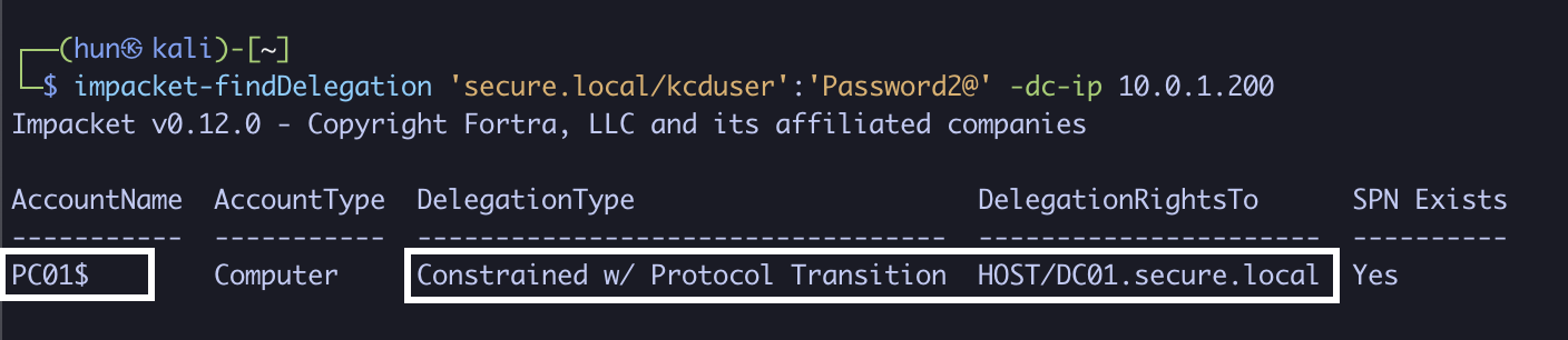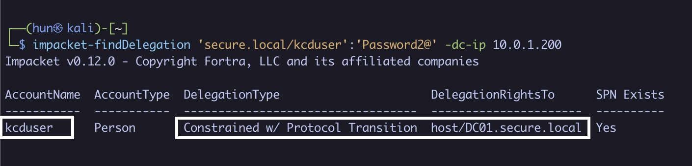 impacket-findDelegation 'secure.local/kcduser':'Password2@' -dc-ip 10.0.1.200