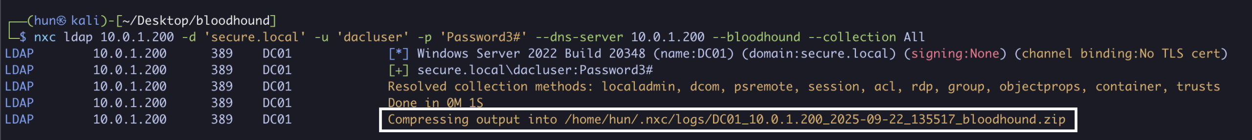 nxc ldap 10.0.1.200 -d 'secure.local' -u 'dacluser' -p 'Password3#' --dns-server 10.0.1.200 --bloodhound --collection All