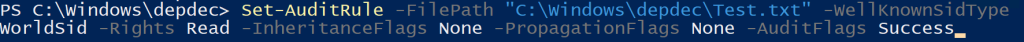 Set-AuditRule -FilePath "C:\Windows\depdec\Test.txt" -WellKnownSidType WorldSid -Rights Read -InheritanceFlags None -PropagationFlags None -AuditFlags Success