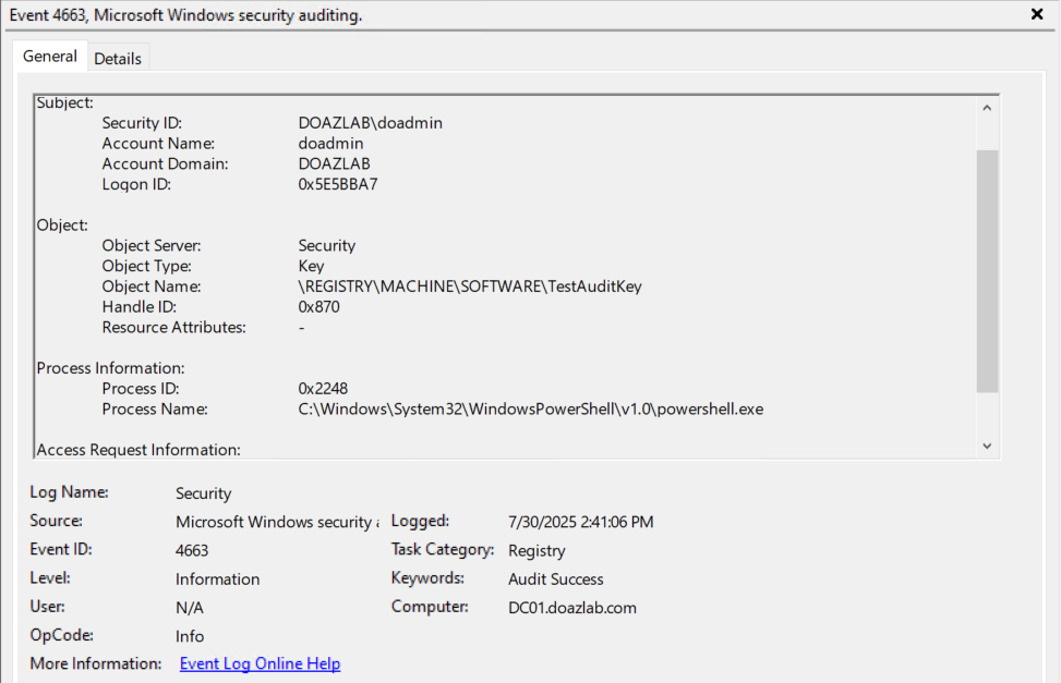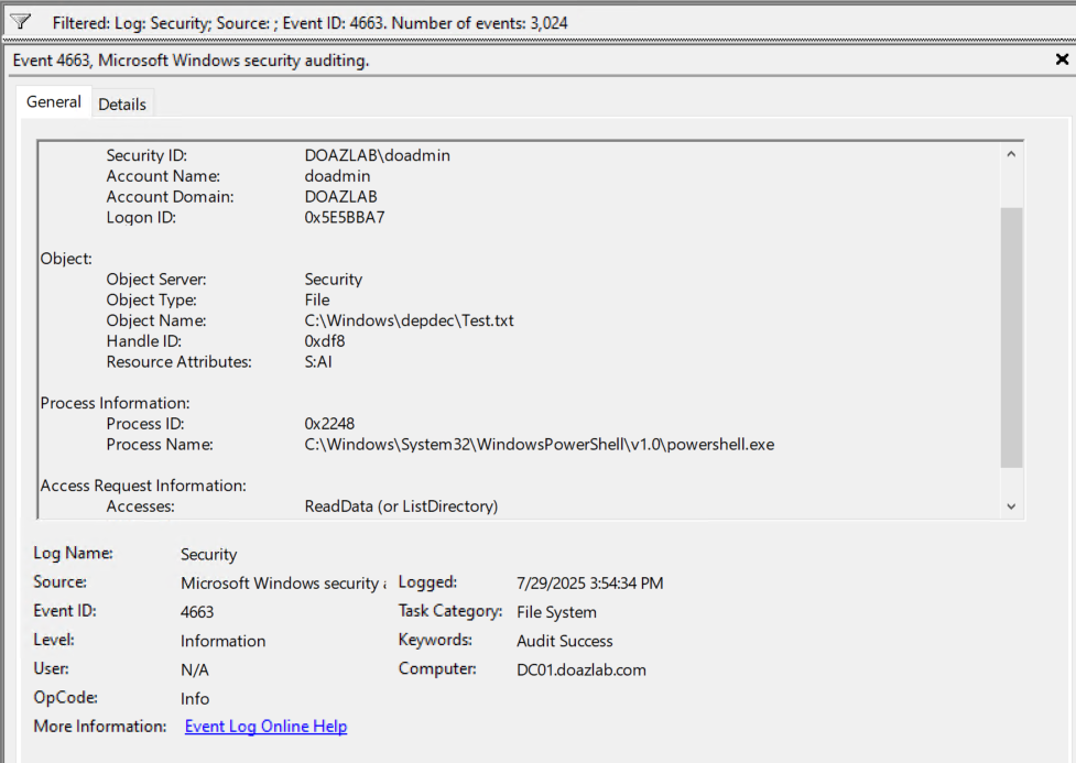 The code for these file system events is 4663. After using Get-Content to “read” the contents of the file you can see the event in event viewer.