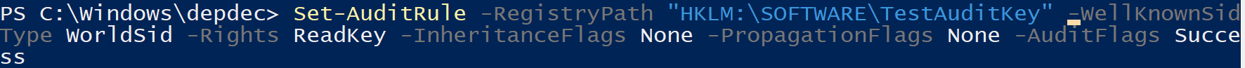 Set-AuditRule -RegistryPath "HKLM:\SOFTWARE\TestAuditKey" -WellKnownSidType WorldSid -Rights ReadKey -InheritanceFlags None -PropagationFlags None -AuditFlags Success