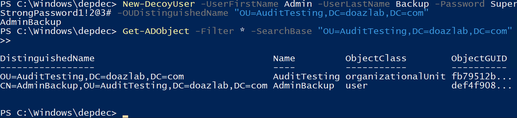 New-DecoyUser -UserFirstName Admin -UserLastName Backup -Password StrongPass123 -OUDistinguishedName "OU=Decoys,DC=domain,DC=com”"