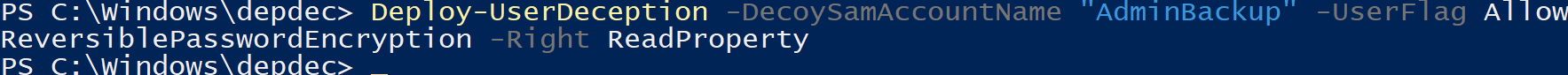 Deploy-UserDeception -DecoySamAccountName "AdminBackup" -UserFlag AllowReversiblePasswordEncryption -Right ReadProperty