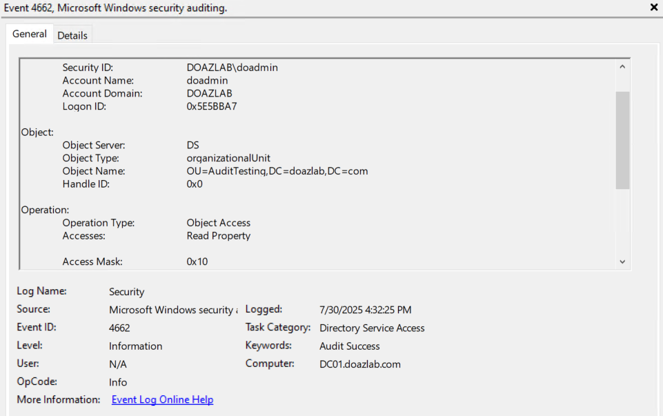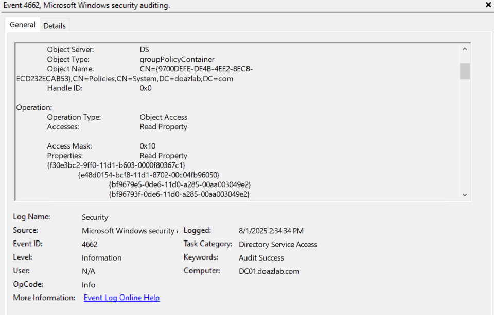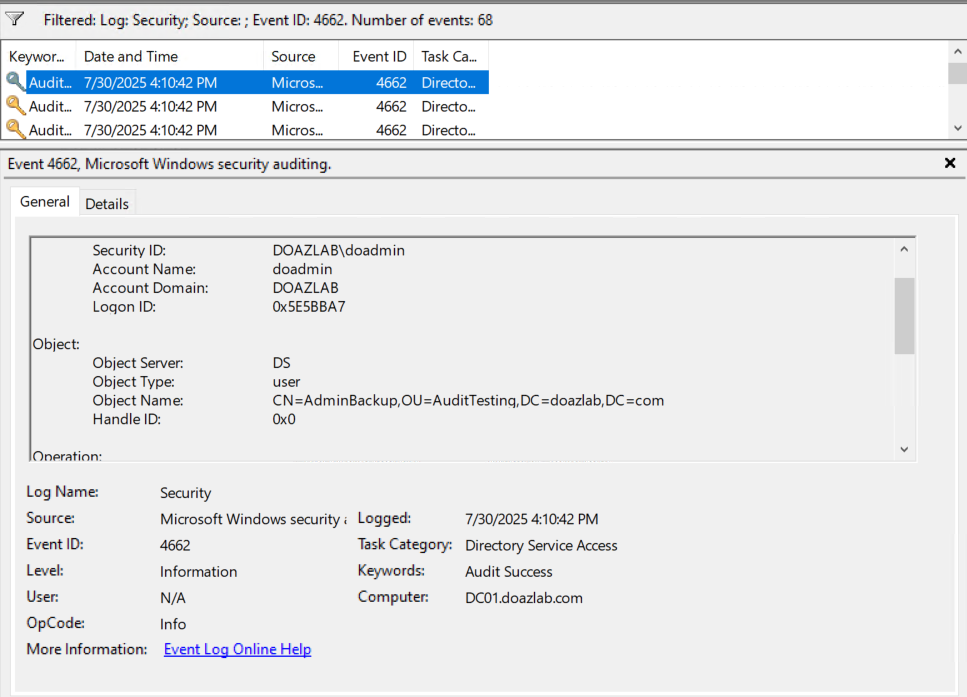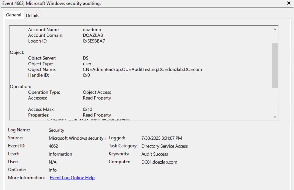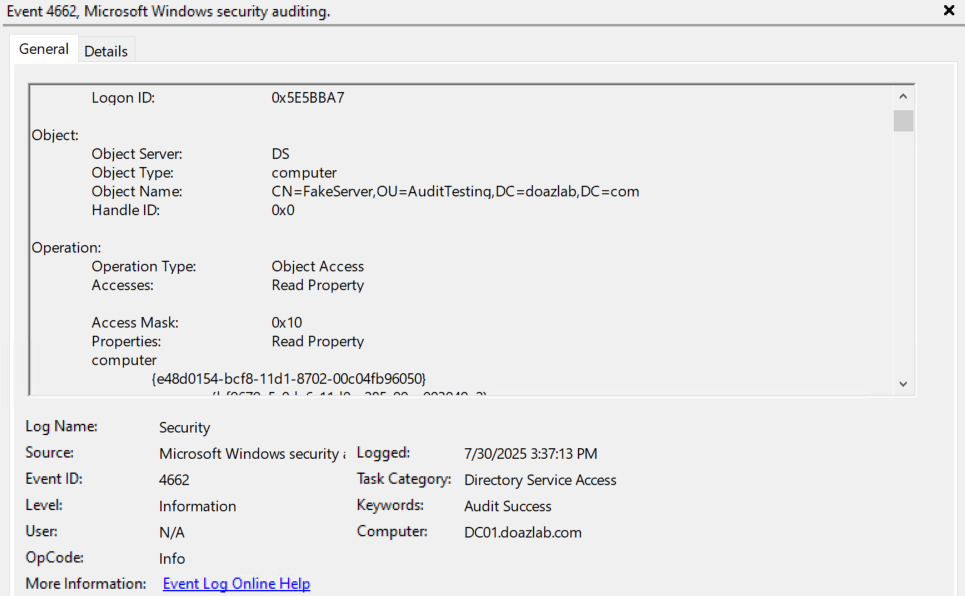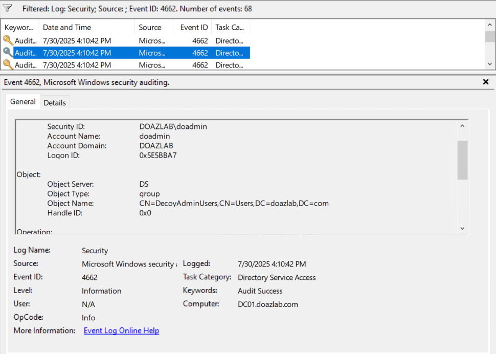 Once applying the audit rule with Deploy-UserDeception, any attempt to enumerate the user will trigger a 4662 event, pictured below.