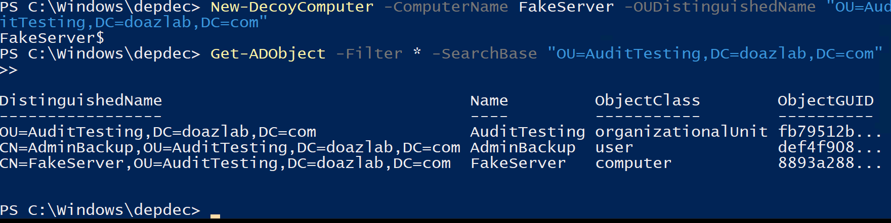 New-DecoyComputer -ComputerName FakeServer -OUDistinguishedName "OU=AuditTesting,DC=doazlab,DC=com"