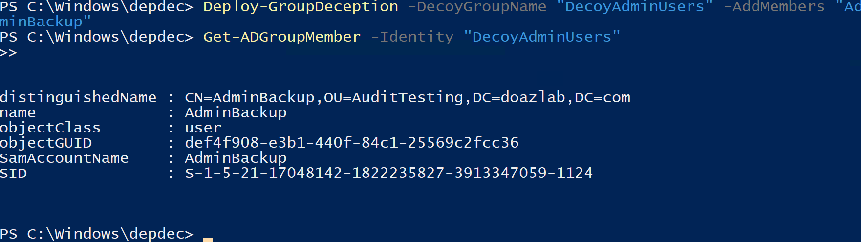Deploy-GroupDeception -DecoyGroupName "DecoyAdminUsers" -AddMembers "AdminBackup"