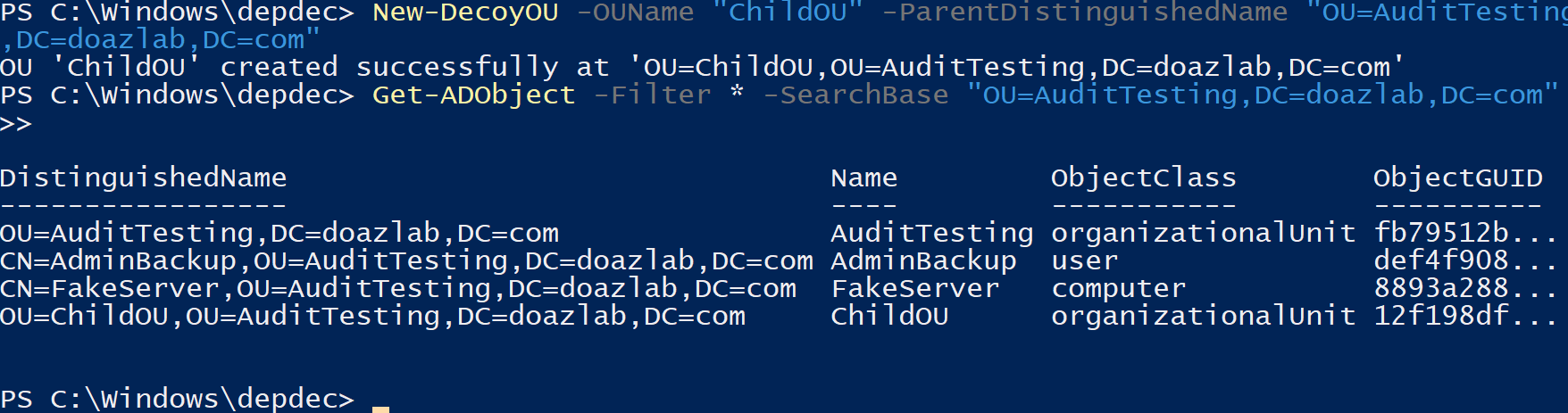 New-DecoyOU -OUName "ChildOU" -ParentDistinguishedName "OU=AuditTesting,DC=doazlab,DC=com"