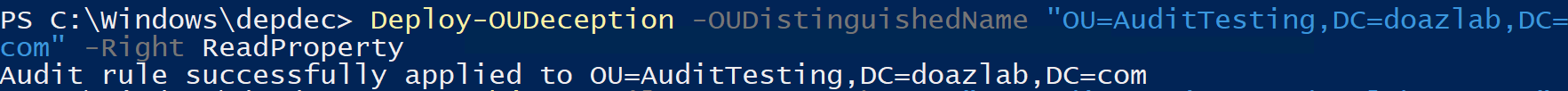 Deploy-OUDeception -OUDistinguishedName "OU=AuditTesting,DC=doazlab,DC=com" -Right ReadProperty