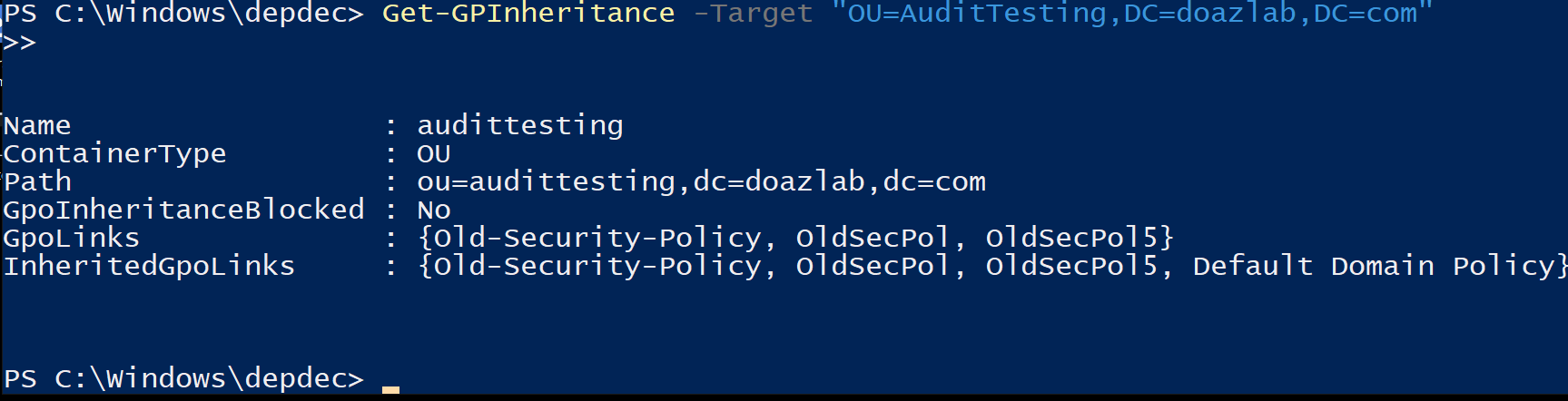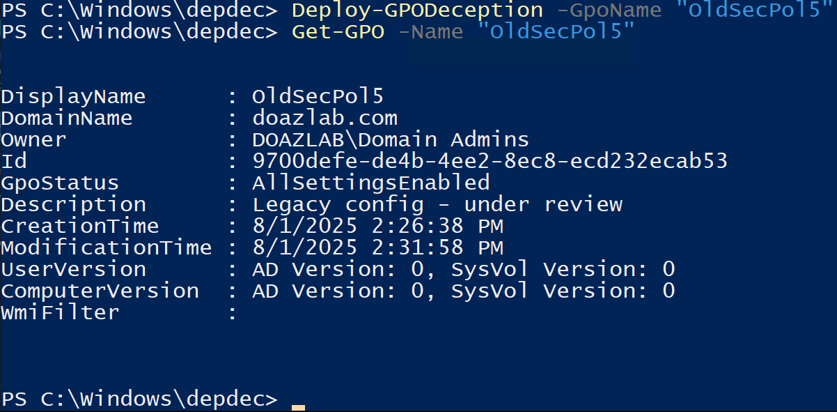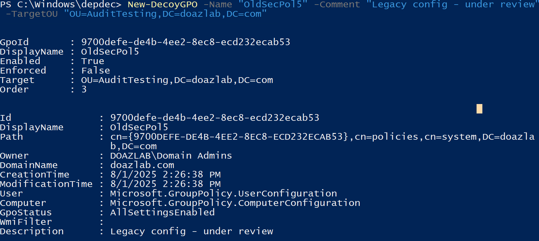 New-DecoyGPO -Name "OldSecPol5" -Comment "Legacy config - under review" -TargetOU "OU=AuditTesting,DC=doazlab,DC=com"