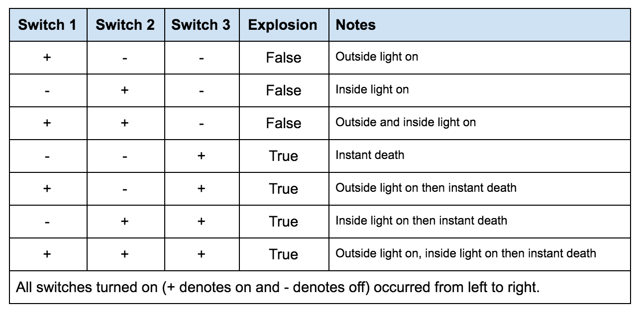 When we had a range of possible configurations, we leveraged truth tables to eliminate the possibility of overlooking even the finest details. For instance, the following truth table reflects the 3-switch configuration on the front of the bomb: