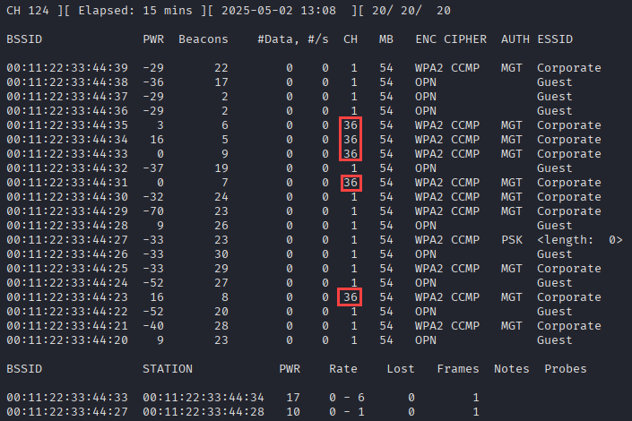 The figure below was entirely simulated as I didn’t think my neighbors would want their access points included in a blog about wireless hacking 🙃. The mixture of Corporate and Guest SSIDs is representative of what you would see during a typical wireless penetration test. It’s also very common to encounter a few hidden wireless networks. The following command is what I’ll typically run during an initial survey. I included the -b abg options to ensure that my wireless card is capturing on both the 2.4 GHz and 5 GHz bands. By default, airodump-ng will only capture on the 2.4 GHz band. The five access points on channel 36 would have been missed otherwise.