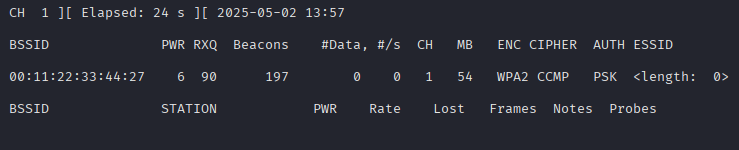 sudo airodump-ng wlan0 -w handshakes -c 1 -t WPA -d 00:11:22:33:44:27