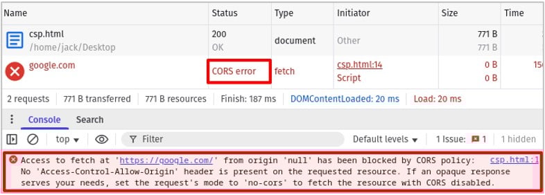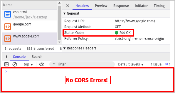 To prove this to you, the simple HTML file below attempts to fetch google.com but is blocked by the browser. The developer console confirms the request was blocked since Google didn’t return a cross-origin resource sharing (CORS) header to relax the same origin policy (SOP).