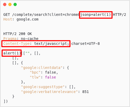 Now what if we configured a web server to accept a GET parameter that dynamically changes the JavaScript returned? This is how JSONP endpoints work. As shown below, google.com has a JSONP endpoint at /complete/search where we can modify the jsonp GET parameter to include arbitrary JavaScript. The returned content type is text/javascript which will be executed if referenced by a script tag.