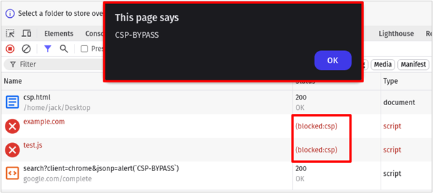 This policy prevents inline script tags from executing and doesn’t even allow JavaScript files from the same origin! However, if google.com hosts any JSONP endpoints, the CSP provides no protection against XSS. The simple HTML file below uses the CSP above. It then attempts to load a JavaScript resource from example.com, then /test.js from the current origin and finally a JSONP endpoint on google.com with an alert() payload in the jsonp parameter.