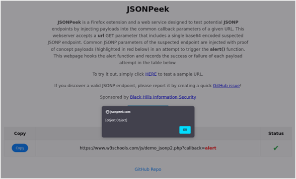 To verify whether the suspected endpoint is using JSONP, there is an exploit button in the extension that submits the URL to a special webpage. I set up some fancy hooking3 such that the page will check the submitted URL using multiple payloads, attempt to trigger the alert() function, and update the results in a table.