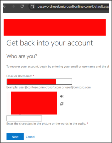 - The attacker performs reconnaissance and checks to see if the target’s tenant has Microsoft SSPR enabled. This is done by visiting https://aka.ms/sspr and entering a valid username and solving a captcha.