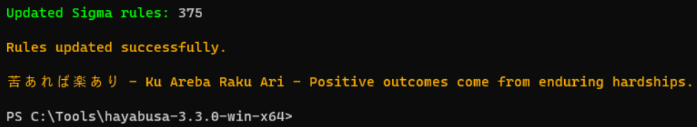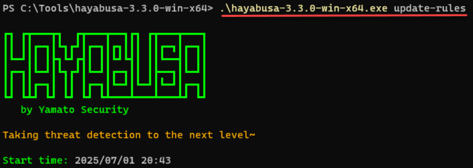 Next, I’ll open Windows Terminal – PowerShell 7, navigate to the “C:\Tools\Hayabusa-3.3.0-win-x64” directory and update Hayabusa rules via the “.\hayabusa-3.3.0-win-x64.exe update-rules” command. You’ll likely see a bunch of updated rules scroll by!