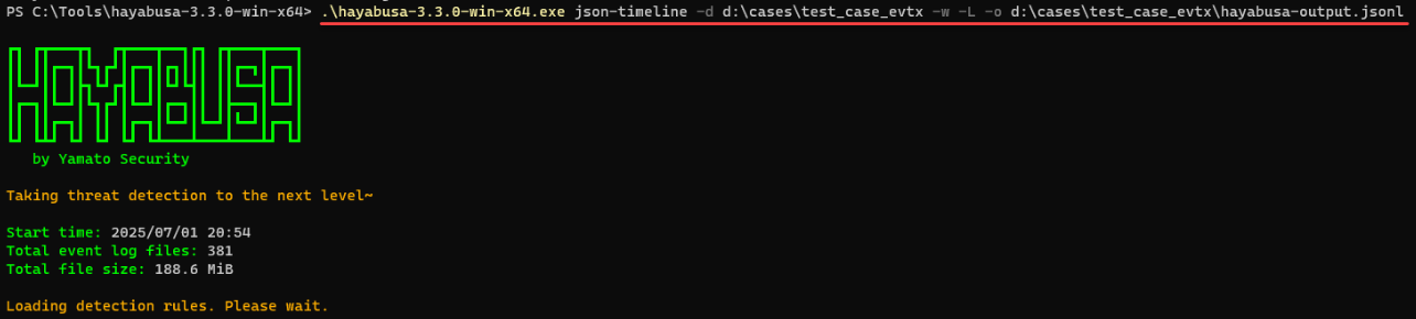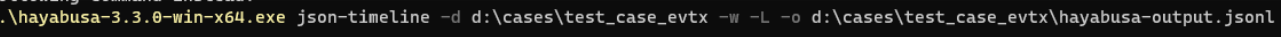 “.\hayabusa-3.3.0-win-x64.exe json-timeline -d d:\cases\test_case_evtx -w -L -o d:\cases\test_case_evtx\hayabusa-output-Host123.jsonl”