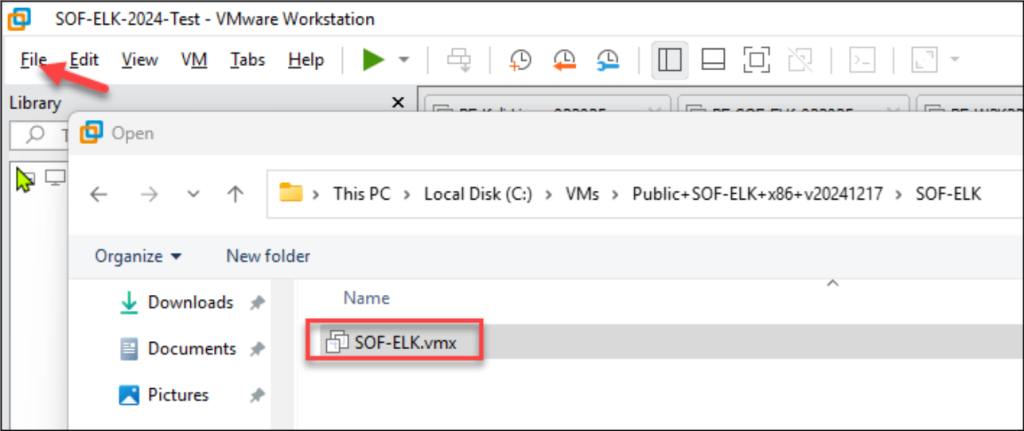 Once you download and extract the VM (v20241217.7z archive at the time of this writing), you can launch VMWare, click “File\Open,” navigate to the extracted SOF-ELK VM archive, and open “SOF-ELK.vmx:”