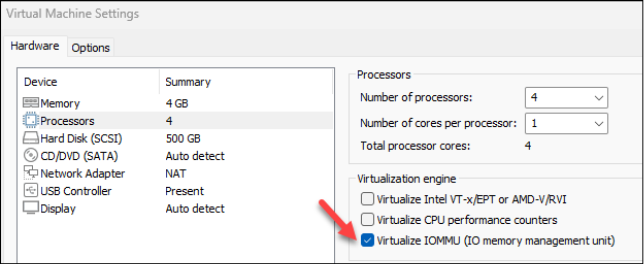 When running the VM on a Windows system, I generally “Edit virtual machine settings” and enable “Virtualize IOMMU” for better UI performance, but that is optional!