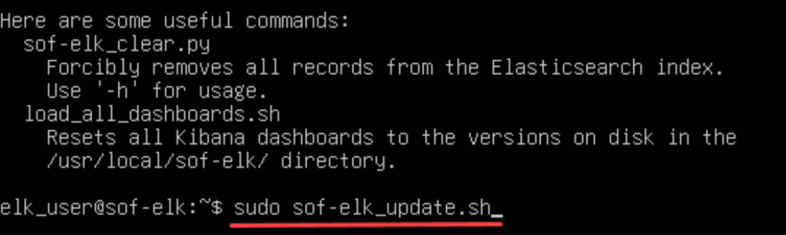Now you can power on your SOF-ELK VM, login using “elk_user” with a password of “forensics,” and then run “sudo sof-elk_update.sh” to make sure SOF-ELK is up to date: