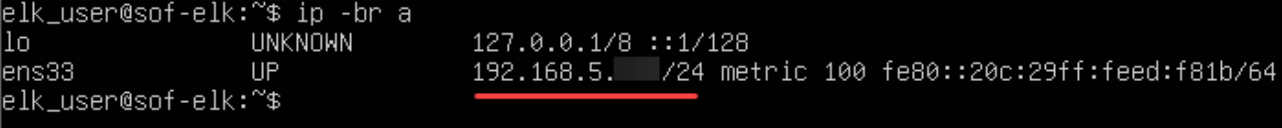 We’ll use “scp” (secure copy) to copy our output data from our Host system to SOF-ELK. First, let’s check the IP address of our SOF-ELK VM: