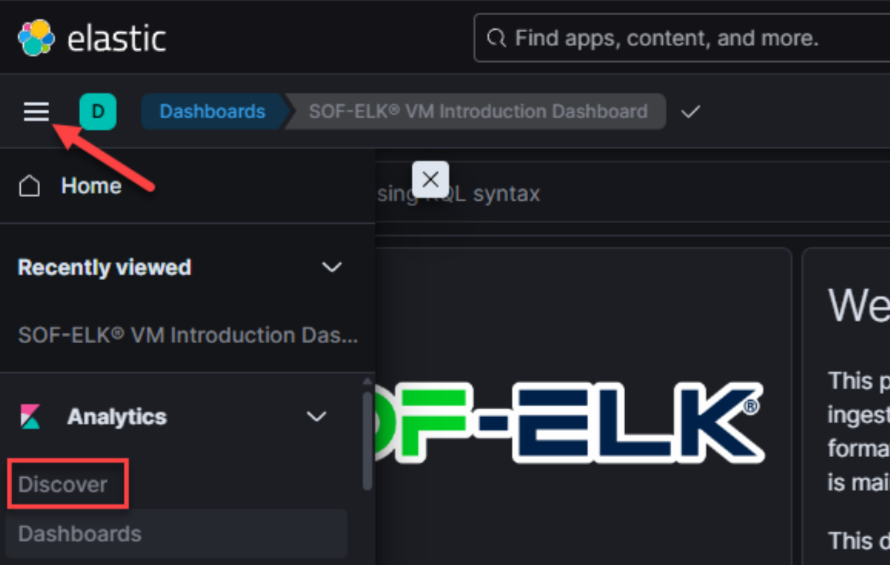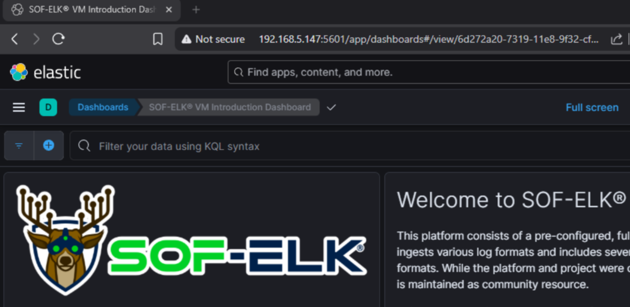 Now we can visit the SOF-ELK web UI and begin our Hayabusa output review. On your Host system, open a browser and visit your SOF-ELK IP address, specifying port 5601: http://192.168.x.x:5601