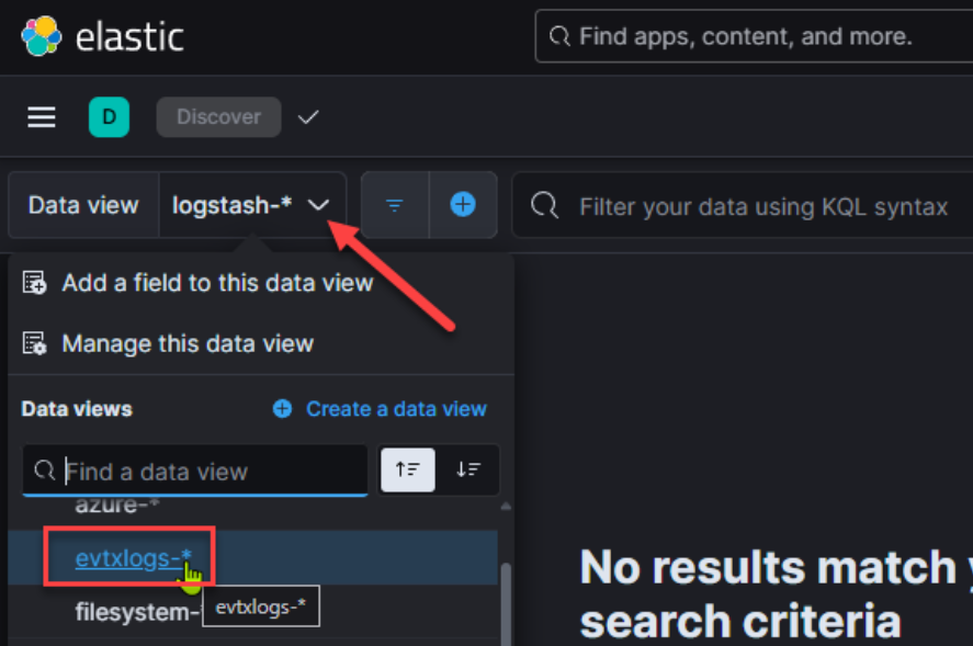 Next, select the “Data View” dropdown and change Data View to “evtxlogs-*”: