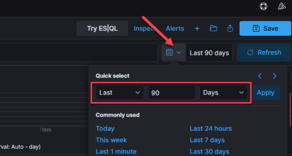 IMPORTANT: Now, we need to change our “data view” date range to reflect relevant dates for our investigation. The easiest way to do this is by clicking the “Date quick select” and selecting a relative range, e.g. “Last 90 days.” It is a good idea to be relatively precise when setting this for an investigation to accurately constrain your results and to improve performance: