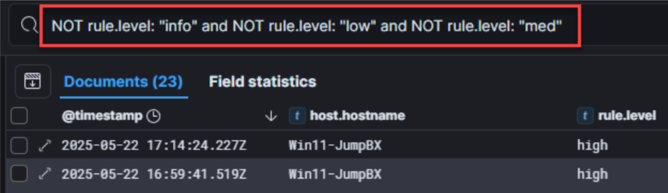 Next, I generally want to review high-severity detections. You can either “filter in” these rule levels (rule.level) or filter out low-severity levels. I’ll go ahead and filter out “low-severity” rule levels (info, low, med) with the following KQL syntax: